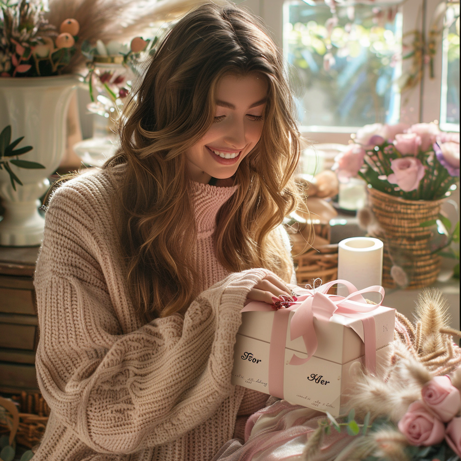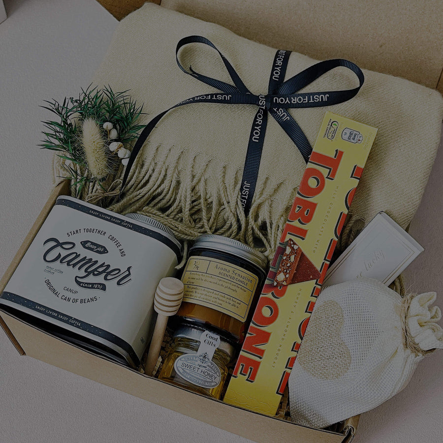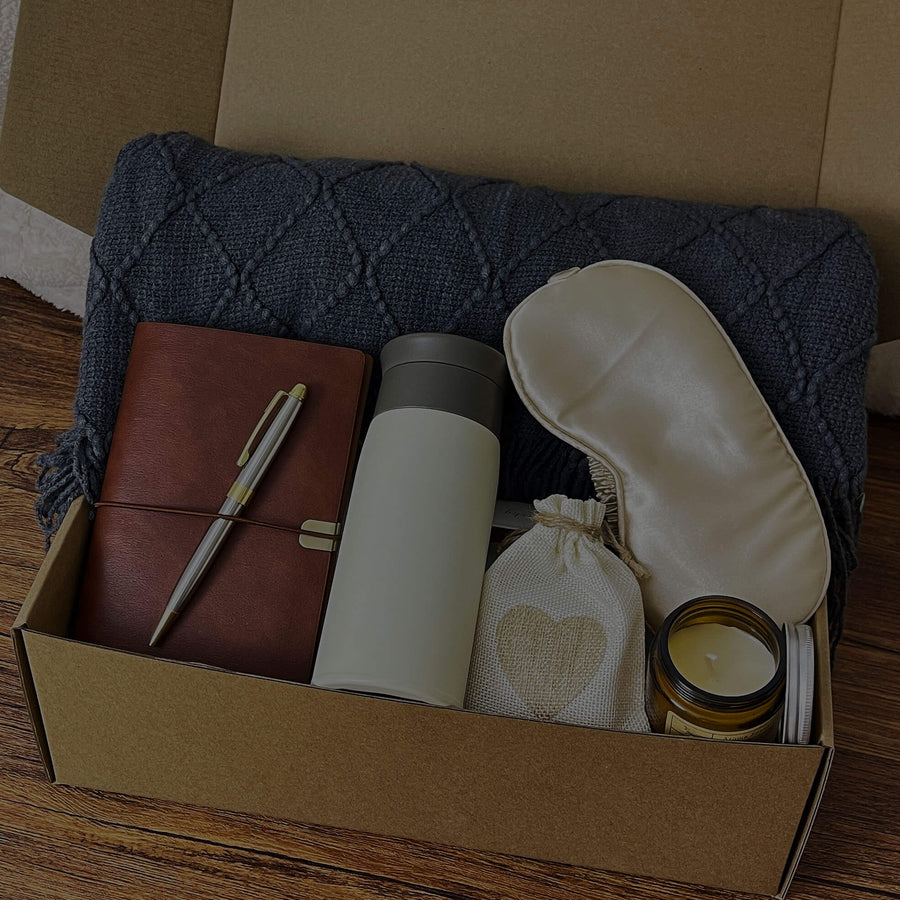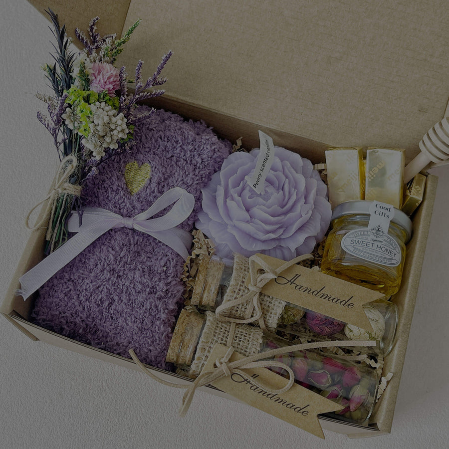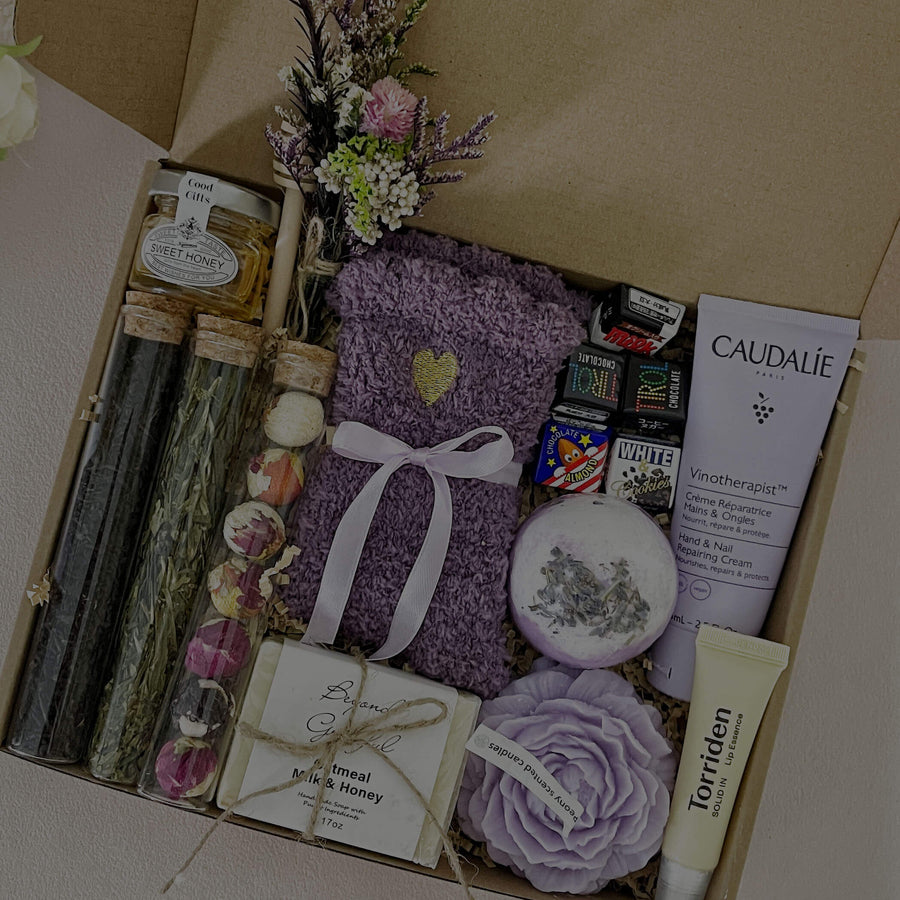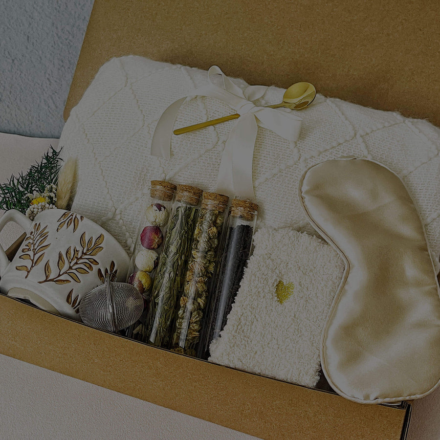 Each gift box is hand-packed with a curated selection of items—from cozy comforts and soothing treasures to delicate accessories—all designed to bring a moment of joy and relaxation.